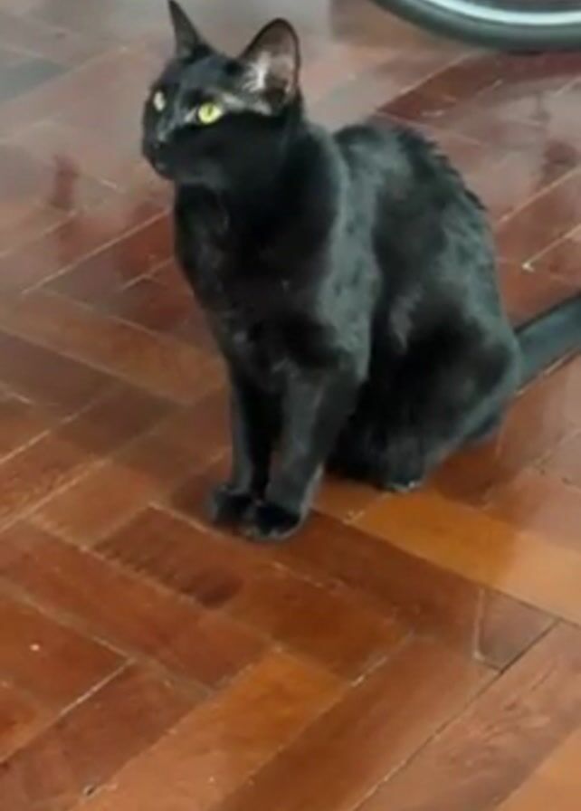 A black cat sits on a wooden floor in front of a bicycle. The cat looks around, and a voice says, "Hey." The voice then makes a kissing sound, and the cat stands up and walks toward the camera. The voice says, "Que pasa."
