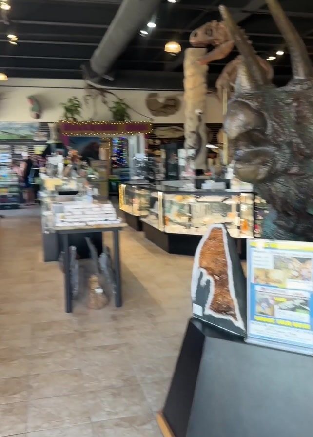 inside of a museum shop, full of dinosaur skeletons and mineral specimens. The shop is brightly lit and spacious. The camera first shows a large dinosaur bust placed on a pedestal with two large mineral specimens. Then the camera pans to show the rest of the store, lined with shelves and display cases containing a variety of items including skulls, skeletons, carved wooden objects, and smaller mineral specimens. People can be seen browsing in the background.