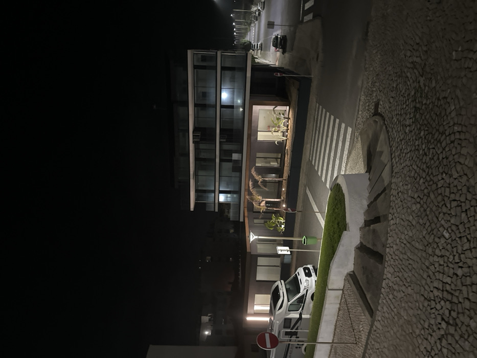 A nighttime urban scene showcases a modern multi-story building with illuminated windows