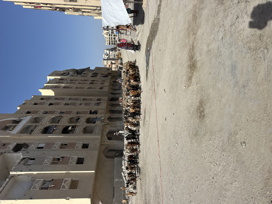 This image depicts a street scene in Deir el-Balah, Palestinian Territory, under a clear blue sky. A large herd of approximately 100-150 goats, exhibiting various brown, black, white, and spotted coats, traverses a wide, unpaved street from left to right in the middle ground. A person on horseback, wearing light-colored attire, is positioned on the left side of the goat herd. Lining the street are multi-story apartment buildings, which display extensive structural damage, including numerous impact holes on facades, sections of walls blown out, and broken or missing windows. Debris and rubble are visible on the ground at the base of these damaged structures. In the right foreground, several individuals are present, one standing near a makeshift white tarp structure. A red line, resembling a rope or tape, extends horizontally across the foreground of the dirt ground, which also features several darker, irregular stains. Additional damaged buildings are visible in the distant background.