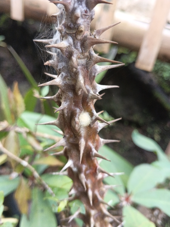A close-up shows a thorny plant stem, potentially Euphorbia milii (crown of thorns)