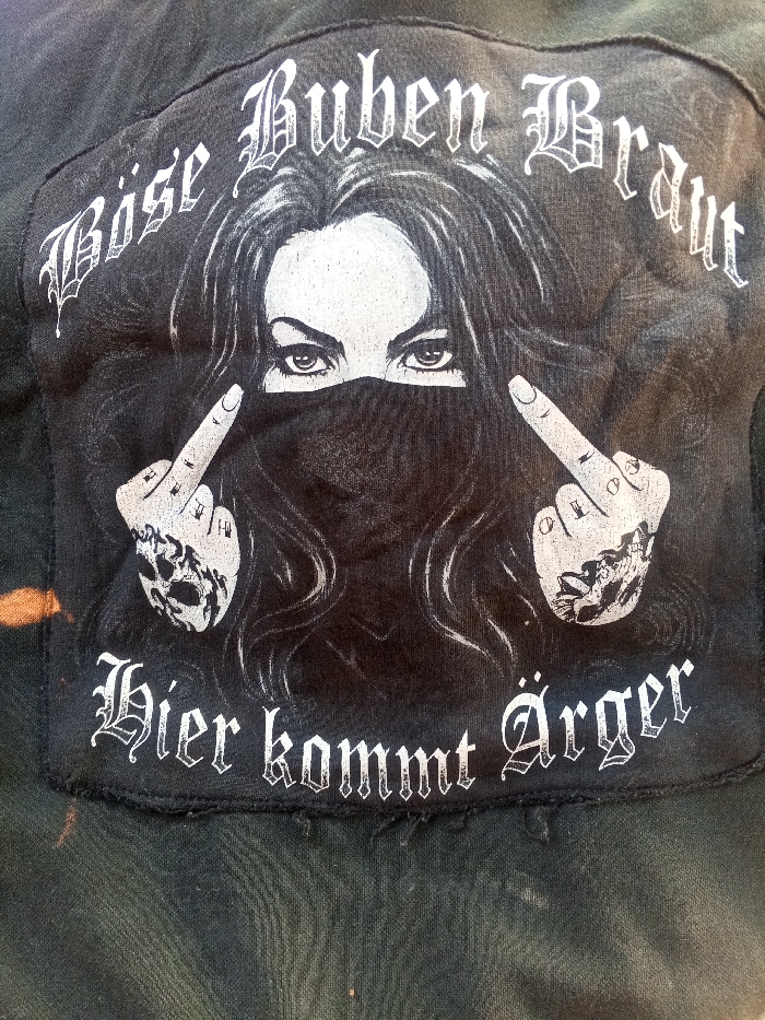 A close-up, downward-angled photograph captures a fabric patch sewn onto a dark, distressed garment. The patch, black with white and light gray printing, features a stylized graphic of a woman. Her intense eyes are visible above a dark bandana covering the lower half of her face. Long, dark, wavy hair frames her head. Both hands are depicted extending from below the face, each raising a middle finger. The left hand (viewer's left) displays a skull tattoo, while the right hand (viewer's right) shows an intricate, possibly floral or gothic, tattoo design. Above the woman's head, in white gothic script, are the words "Böse Buben Braut." Below the hands, also in white gothic script, is the phrase "Hier kommt Ärger." The patch exhibits minor wear and fraying, particularly along its bottom edge where it is stitched to the underlying garment. The garment itself is a dark, coarse fabric, possibly denim or canvas, showing discoloration and faded areas, including an orange-brown stain visible on the left side (viewer's left). The scene is located in Alto Hospicio, Chile.