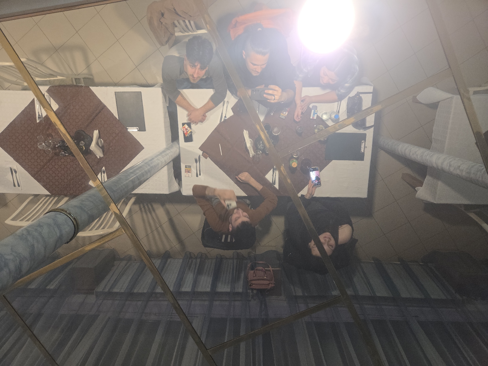 gathering of six people sitting at two tables in what appears to be a restaurant or bar, as reflected in a mirrored ceiling