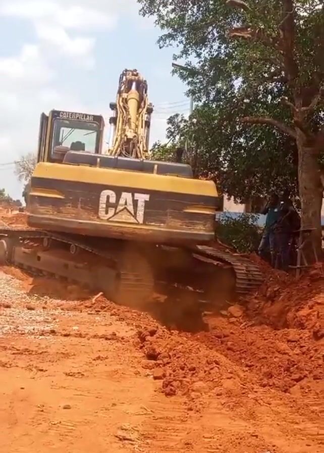 A yellow and black Caterpillar excavator is the central focus, seen from its rear and side as it moves along a red dirt road. To the left of the excavator, a worker in an orange vest stands near a pile of gravel. To the right, a small group of people are clustered under a large tree near what appears to be a building. The sky is partly cloudy. The excavator's treads are stirring up the dirt, and the overall scene suggests ongoing construction or road work.