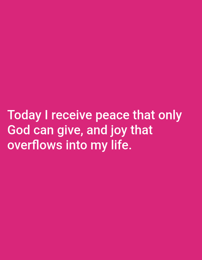 The image displays a text message with a religious affirmation set against a solid pink background. The text, written in a clean, white font, reads, "Today I receive peace that only God can give, and joy that overflows into my life." The message is centered, creating a visual focus on the spiritual theme of peace and joy through divine intervention. The overall impression is one of hope, faith, and positivity.