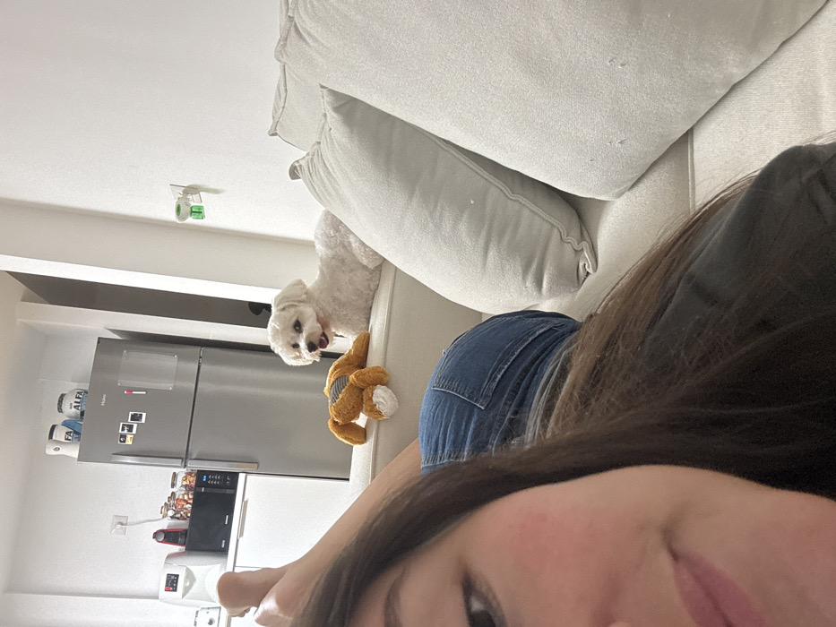 This image depicts an indoor domestic scene located in Ramat HaSharon, Israel. In the immediate foreground, the face of a female individual is partially visible on the left, showing her left eye, cheek, and a portion of her mouth, framed by long dark hair. Her bare feet are visible resting on a light-colored, multi-cushioned sofa. A small, white, fluffy dog, appearing to be a Maltese or Bichon Frise, is lying on the backrest of the sofa to the right of the individual, looking towards the right with its mouth slightly open. Adjacent to the dog on the sofa cushion is a brown plush toy, possibly a rabbit. The background reveals a kitchen area to the left, featuring a silver Haier refrigerator adorned with several small magnets on its door. Two containers, one prominently labeled "ALFA," are placed on top of the refrigerator. To the left of the refrigerator, on a white countertop, are a black microwave oven, a red and black espresso machine, a white water dispenser, and multiple glass jars containing various contents. The right background consists of a plain white wall, on which a small green and white wall-mounted device is plugged into an electrical outlet. The scene is brightly illuminated by internal light sources.