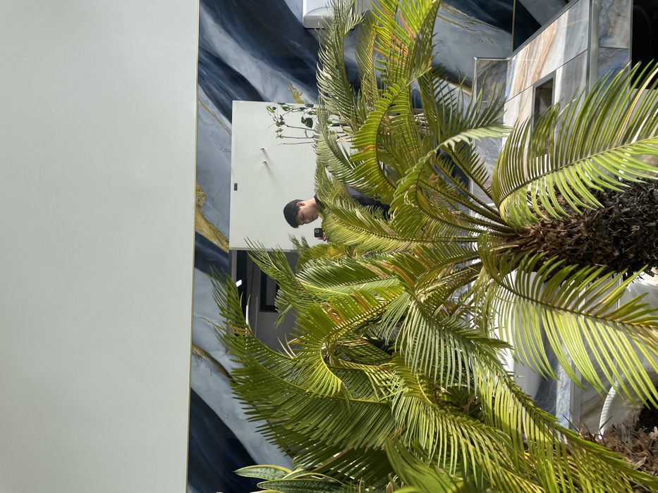 A vibrant palm tree fills the frame, its fronds arching and casting shadows. Reflected in a mirror behind it is a person holding a phone, seemingly taking a photo of the scene. The wall behind the mirror is decorated with a swirling pattern in shades of blue, grey, and gold. A plain white wall occupies the left side of the image. The overall composition is slightly tilted, adding a dynamic feel.