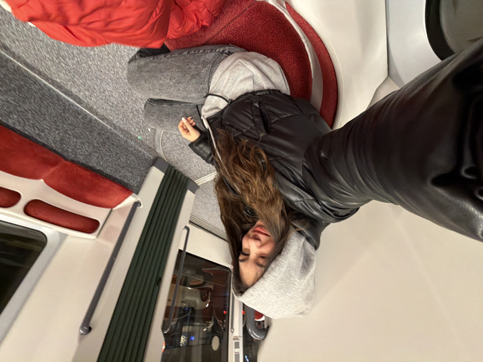 A woman poses indoors, likely on public transportation. She sits with her legs extended toward the camera, clad in gray jeans, a gray hoodie, and a black puffer jacket. Her long, wavy brown hair falls over her shoulder. The interior features gray carpeting, red seats, and a large window with blurred city lights visible outside. The overall image is slightly rotated clockwise.