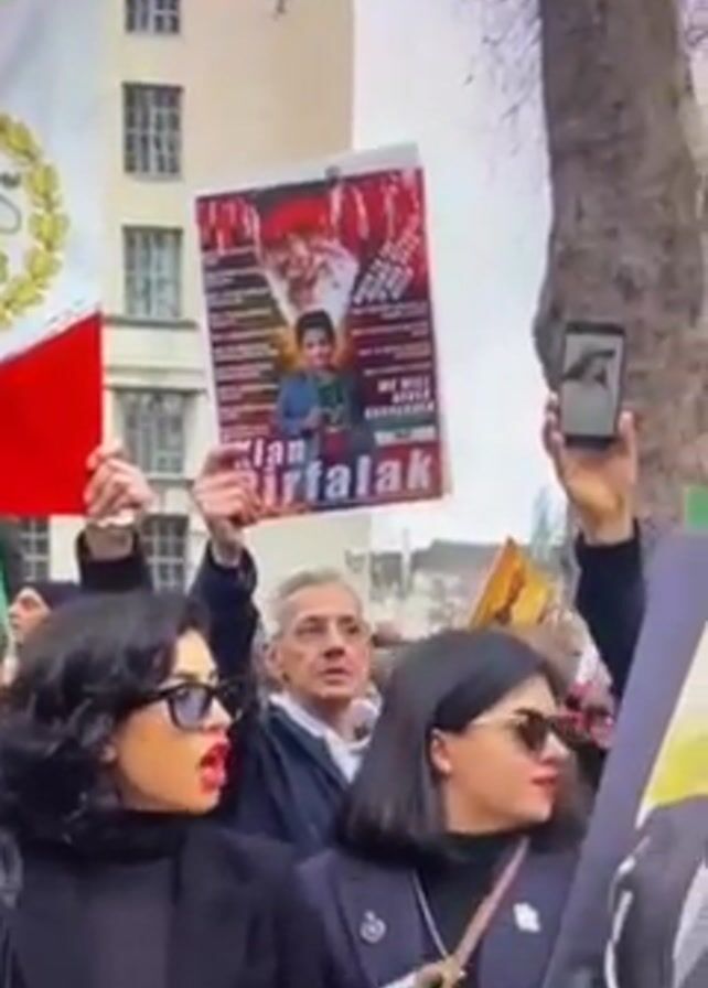 A group of people protest in an urban area, likely in Europe given the architectural style of the buildings in the background. They hold Iranian flags (with lion emblem), signs with images of people and text, and use mobile phones, possibly to record the event. The protesters are dressed in dark clothing, some wearing sunglasses. They are shouting in unison, expressing a message, presumably about political or social issues related to Iran. The environment is outdoors on a cloudy day.