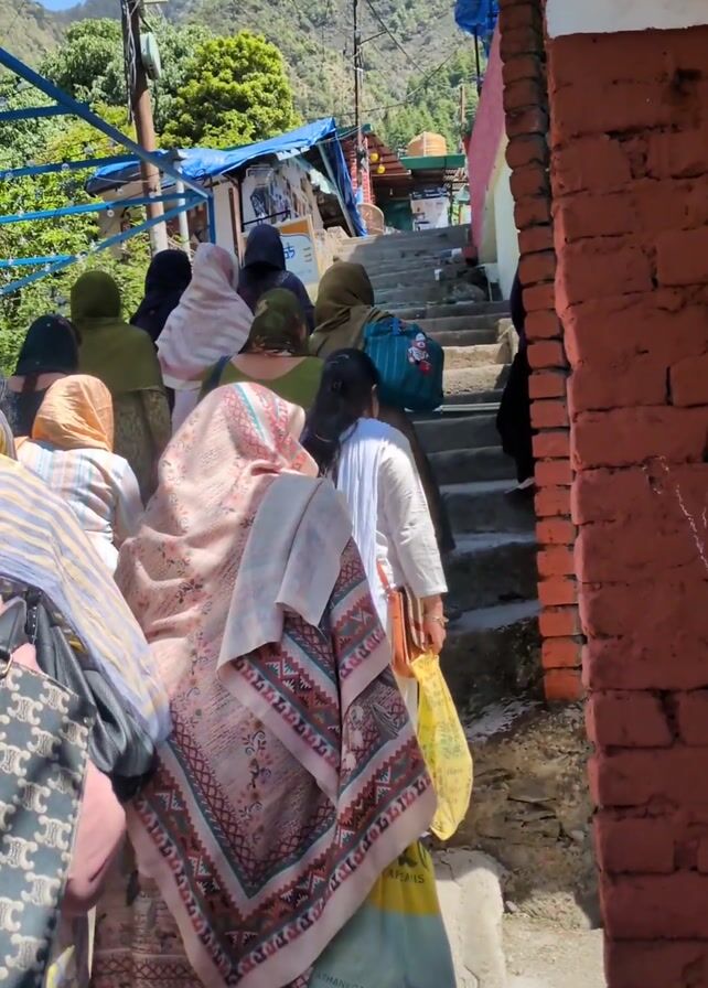 A group of people are walking up a set of stone steps, presumably outdoors given the presence of trees and mountains in the background. The individuals appear to be primarily women, many wearing traditional South Asian clothing, including headscarves or shawls. Some are carrying bags. The steps are located beside a red brick wall on one side and a blue metal railing on the other. There are power lines visible above. The lighting suggests it is a sunny day.