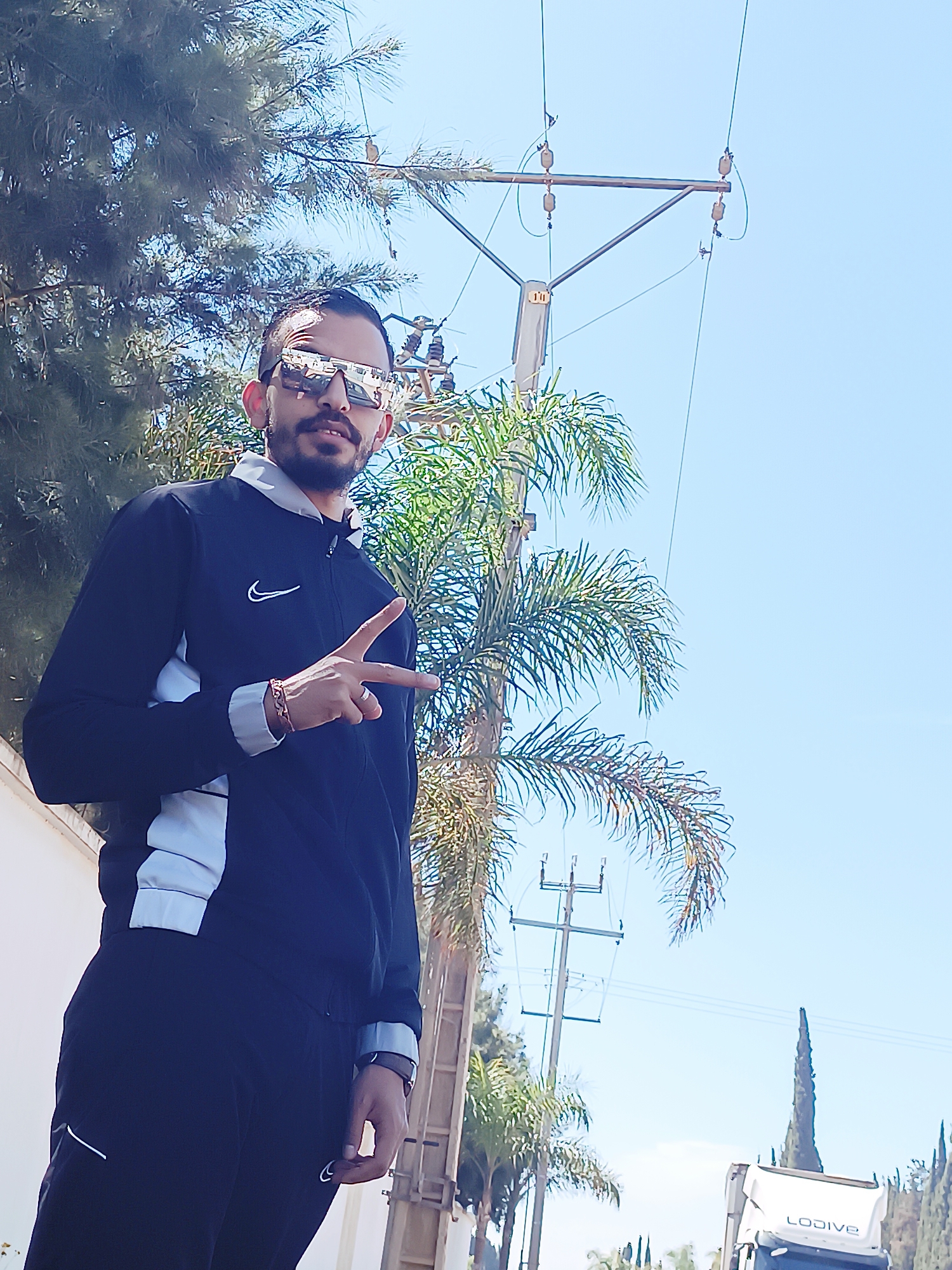 A male individual stands outdoors, slightly off-center to the left, facing the camera on a street in the city of Unknown, Unknown. He is wearing mirrored sunglasses, a dark blue full-zip track jacket with light grey side panels and a white Nike swoosh on the left chest, and dark blue track pants. A gold-colored chain link bracelet is on his left wrist, and a ring is on his left ring finger. He is making a V-sign (peace sign) with his right hand. The background consists of a clear blue sky, green palm trees, and dark green coniferous trees. A utility pole with a cross arm and electrical lines is visible, bearing a "1U" marking. A white wall is present on the left. On the far right, the upper front section of a white commercial vehicle with the word "LODIVE" printed on its side is partially visible.