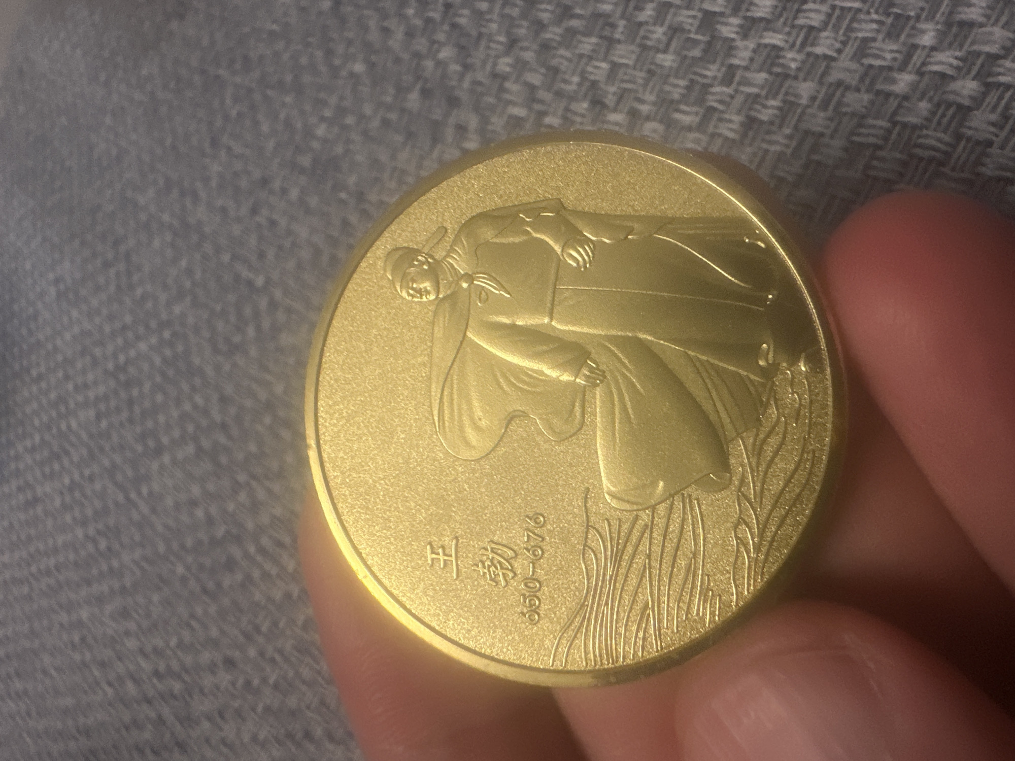 A close-up shot depicts a gold-colored commemorative coin held between fingers. The coin features a stylized image of a person in traditional dress. Below the figure, there is some text, possibly Chinese characters and the numbers "650-676". The background is a textured, gray surface, possibly fabric. The image does not contain elements linking it to Munich, Germany.