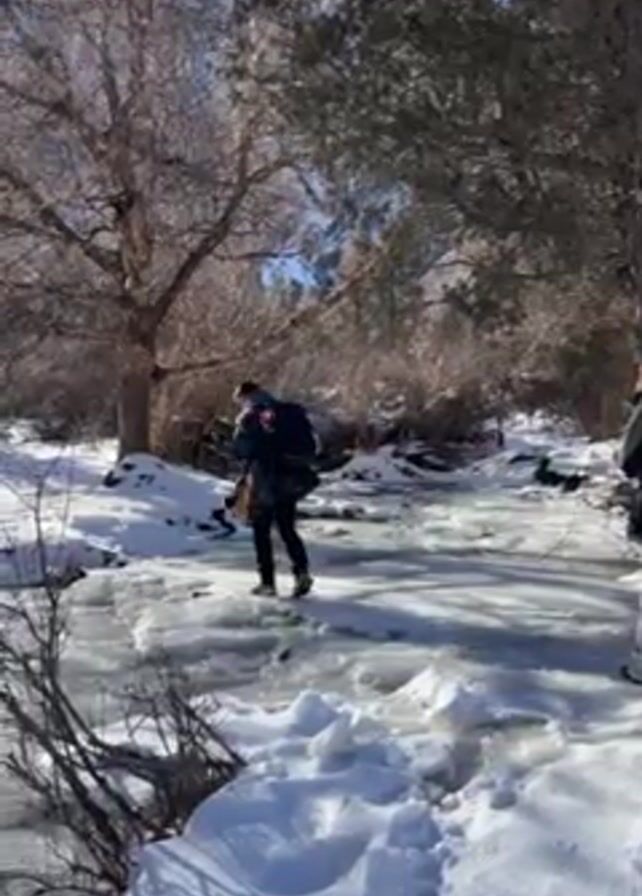 A person wearing a dark jacket and backpack walks across a partially frozen stream or river in a snowy landscape. The ice appears thin and has open water areas. The person is walking carefully across the ice, with another person standing nearby on the snowy bank. Trees surround the area, and the sky is visible in the background. The person walking on the ice slips slightly and uses their arms for balance but continues to walk forward. Someone can be heard speaking in the background.