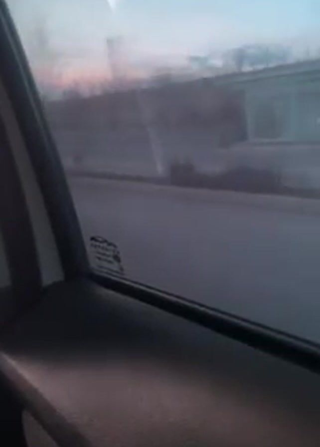 view from inside a car, looking out of a side window. The car is moving, and the scenery passing by outside includes a road, trees, and buildings. The sky is a mix of blue and orange, suggesting it is either dawn or dusk. The window is slightly tinted, and there is a small sticker or decal visible on the lower left corner of the window. The interior of the car is visible, including a portion of the door panel, which is dark gray.