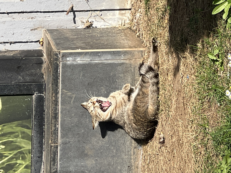 A tabby cat, exhibiting brown, black, and tan markings, is depicted sitting upright on a patch of dry earth and sparse green grass. Its back rests against a dark gray tiled structure that forms the lower portion of a building. The cat's mouth is wide open, exposing its tongue, teeth, and palate, consistent with a yawn or vocalization. Its front paws are drawn inward, and its hind legs are extended forward to its right. Sunlight, originating from the right, casts a distinct shadow of the cat onto the ground to its left. Above the dark tiled structure, a window with a black frame reflects a distorted green image, likely foliage. To the right of the tiled structure, a lighter gray wall with vertical grooves is visible. A small, yellowish-orange object rests on the corner ledge of the dark tiled structure where it meets the lighter wall. The foreground contains greener grass interspersed with small white flowers. This scene is located in Dobrota, Montenegro.