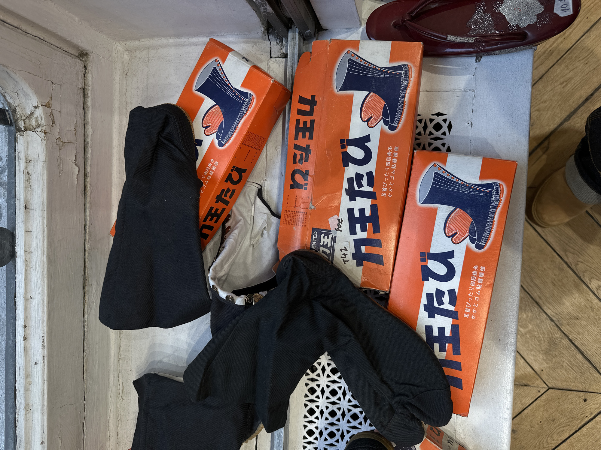 The image presents an overhead view of a retail display inside a shop in Paris, France. A collection of traditional Japanese tabi socks and their packaging are arranged on a weathered white surface, possibly a shelf or windowsill. Central to the scene are three orange and white cardboard boxes, oriented horizontally, featuring the Japanese brand "力王たび" (Rikiou Tabi) and an illustration of a navy-blue tabi boot with an orange separated toe section. The boxes' Japanese text describes "足首ぴったり四段掛糸 かかとゴム縫補強" (ankles fit perfectly with four fasteners, reinforced with rubber stitching at the heel). Loosely draped and folded on and around these boxes are two pairs of black, textile tabi socks, one pair partially open to reveal metal hook-and-eye closures. To the lower right, a single dark red, lacquered sandal, resembling a Japanese geta, is visible, decorated with a silver floral motif. A price tag, partially legible as "10," is affixed to it. Beneath the items, a white, patterned grate or lattice structure is present. The background reveals severely cracked and peeling white paint on what appears to be a window frame or architectural molding, indicating an older building. In the lower left corner, a section of a light brown wooden parquet floor is visible, along with the lower portion of a person's leg clad in blue jeans and a tan shoe, suggesting the presence of an individual viewing the display.