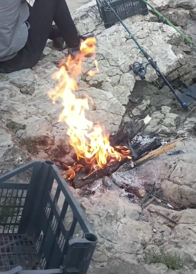 A short video shows two people sitting and standing on a rocky outcropping near a body of water, with fishing rods and crates nearby. A small fire burns on the rocks, and one person appears to be preparing food, possibly meat, stored in a blue bag inside one of the crates. The scene suggests a fishing outing with a small campfire.