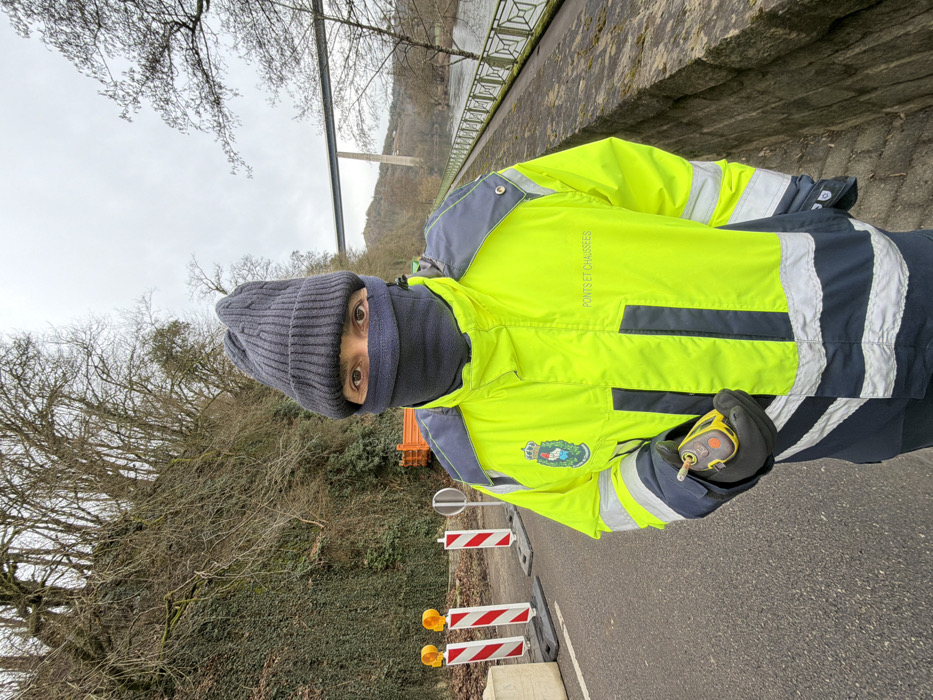 An individual stands centrally on an asphalt road in Wasserbillig, Luxembourg, under an overcast sky. The person, appearing male, wears a dark grey knitted beanie and a dark grey neck warmer covering the lower face, exposing only the eyes which look directly at the viewer. A high-visibility lime green and dark blue jacket with reflective stripes is worn, displaying a multi-colored crest on the left chest and the text "PONTS ET CHAUSSÉES" on the right chest. Dark gloves cover both hands; the right hand holds a yellow and grey electronic device with a black button and a small antenna. To the left of the individual, a light-colored concrete barrier precedes three red and white striped traffic bollards, each topped with an amber flashing light. A circular traffic sign is positioned among the bollards. Further left, the rear section of an orange-colored vehicle is partially visible on the roadside. A steep hillside, densely covered with green ivy and bare deciduous trees, rises behind these objects. To the individual's right, a low, moss-covered stone wall parallels the road. Beyond this wall, a dark green metal railing runs along the edge of a river, likely the Sauer. In the distant background, a large concrete viaduct with a prominent concrete pier spans the river and valley, consistent with the A1 motorway bridge. Bare trees and distant hills complete the background vista.