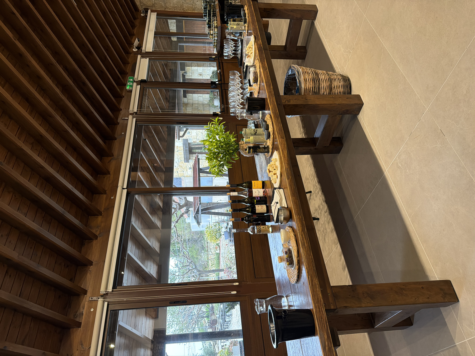 The image depicts the interior of a building in Omodos, Cyprus, featuring a long wooden table set with wine bottles, wine glasses, various food items, and a green plant arrangement. The table runs parallel to a series of large, multi-paned windows offering a view of the outdoors, which includes greenery and buildings. The building's interior is characterized by a wooden, slatted ceiling. The floor is tiled with large, light-colored tiles. A woven basket sits on the table towards one end. The setup suggests a wine-tasting or catering event. The scene is brightly lit and appears unoccupied at the time the photograph was taken.