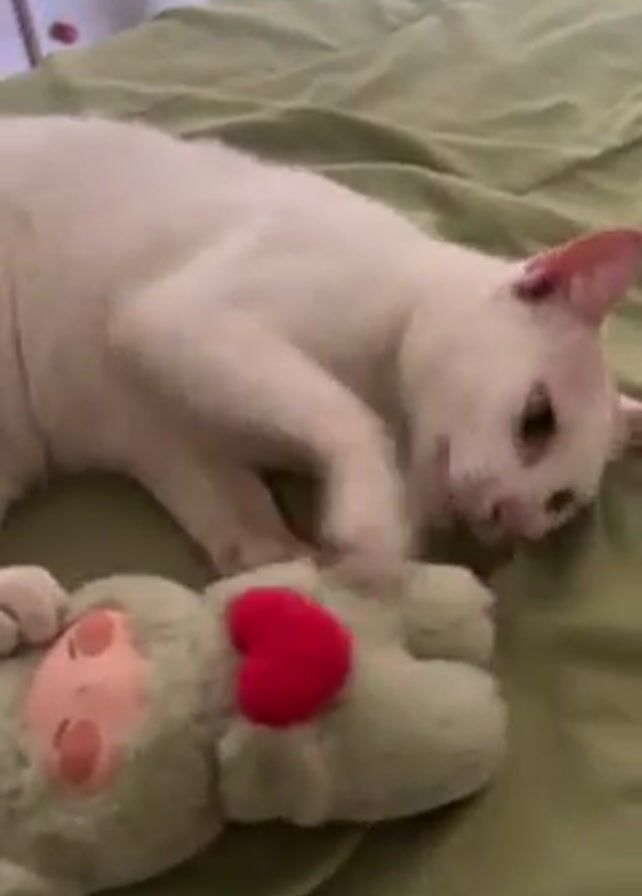 white cat lying on a light green bedsheet. Initially, the cat bites and claws at a small, light green stuffed toy with a pink face and a red heart on top. The cat then lies next to the toy, playing with it gently. A hand then appears, gently touching the cat's nose.