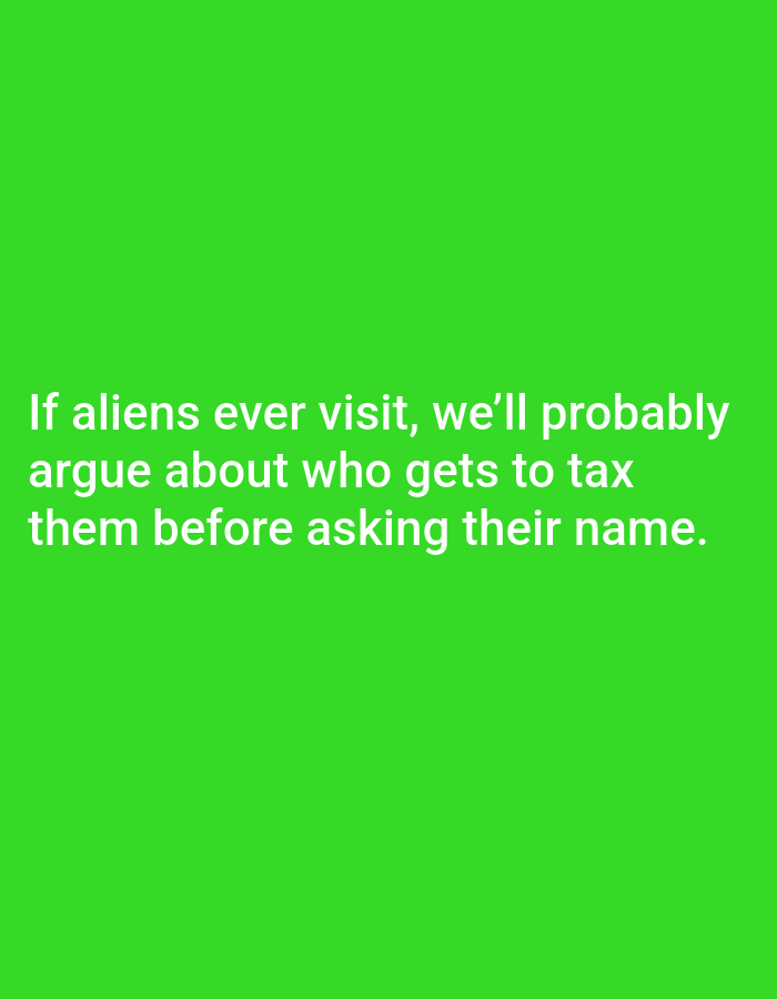 The scene consists of a uniformly colored digital display. The background is a solid, vivid green. Centered horizontally in the lower mid-section of the frame is white sans-serif text stating: "If aliens ever visit, we'll probably argue about who gets to tax them before asking their name." No individuals, physical objects, actions, or specific environmental features are depicted. There is no visual information within the image to determine a physical location such as Redondo Beach, United States.