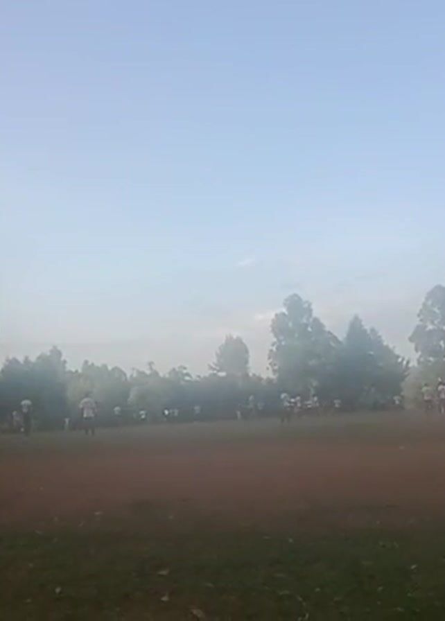 grassy field with a group of people in the distance, appearing to be playing a game, possibly soccer. The field is surrounded by trees. A person in a green shirt walks along the right edge of the frame. The sky is light blue and somewhat hazy. The video appears to be taken from a slightly low angle.