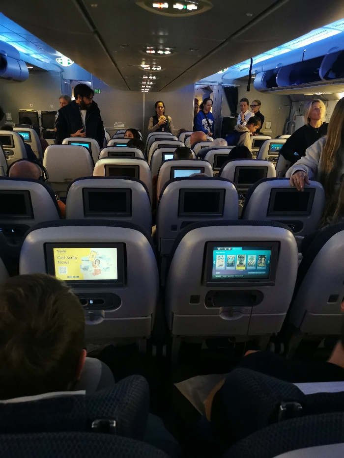 The image displays the interior of a commercial aircraft cabin, observed from a forward-facing perspective within an aisle seat