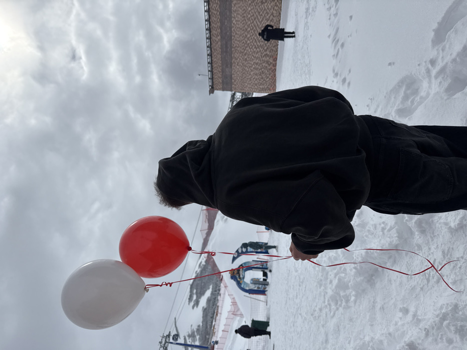 The image depicts a snow-covered outdoor scene in a ski resort area within Yeghipatrush, Armenia, under an overcast sky. In the foreground, a person is seen from behind, wearing a dark hooded sweatshirt and dark pants. Their right hand holds two balloons, one white and one red, attached by red ribbons. The ground is covered in deep snow, showing scattered footprints. In the middle ground to the left, a snow-covered ski slope ascends into the distance, with a ski lift system featuring towers and cables visible. An inflatable blue and white archway is positioned near the base of the slope. Two indistinct figures are present in this area; one on the far left and another near the archway. To the right, a multi-story building with a reddish-brown textured facade is visible. Further right and deeper into the scene, another individual in a dark, long coat is walking away from the camera.