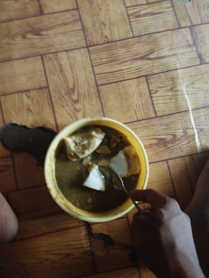 - "A person is sitting on the floor, using a metal spoon to eat a bowl of dark, viscous stew with white chunks of food" by FM-NWFJ03, licensed under CC BY 4.0