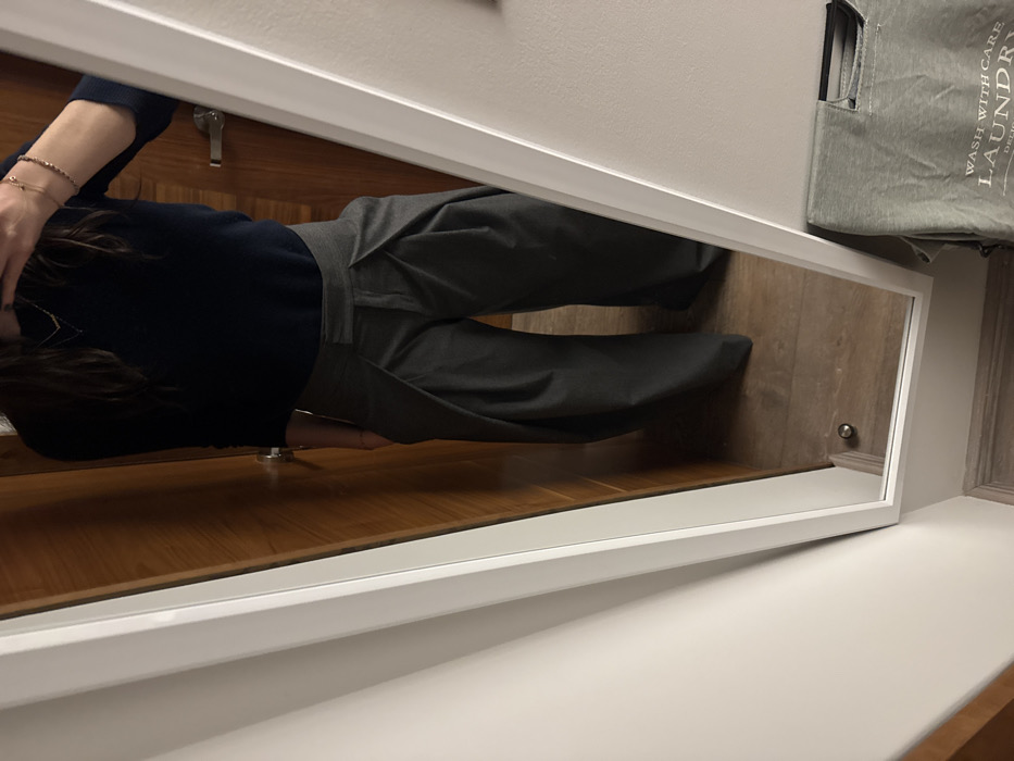 A person is reflected in a mirror. The person wears a dark blue sweater and gray pants. The mirror is framed in white and sits on a white surface. The background behind the mirror reflection appears to be a room with a wooden floor. There is also a gray laundry bag with black lettering, which reads "WASH WITH CARE LAUNDRY." A chrome faucet is attached to the wooden wall behind the person.