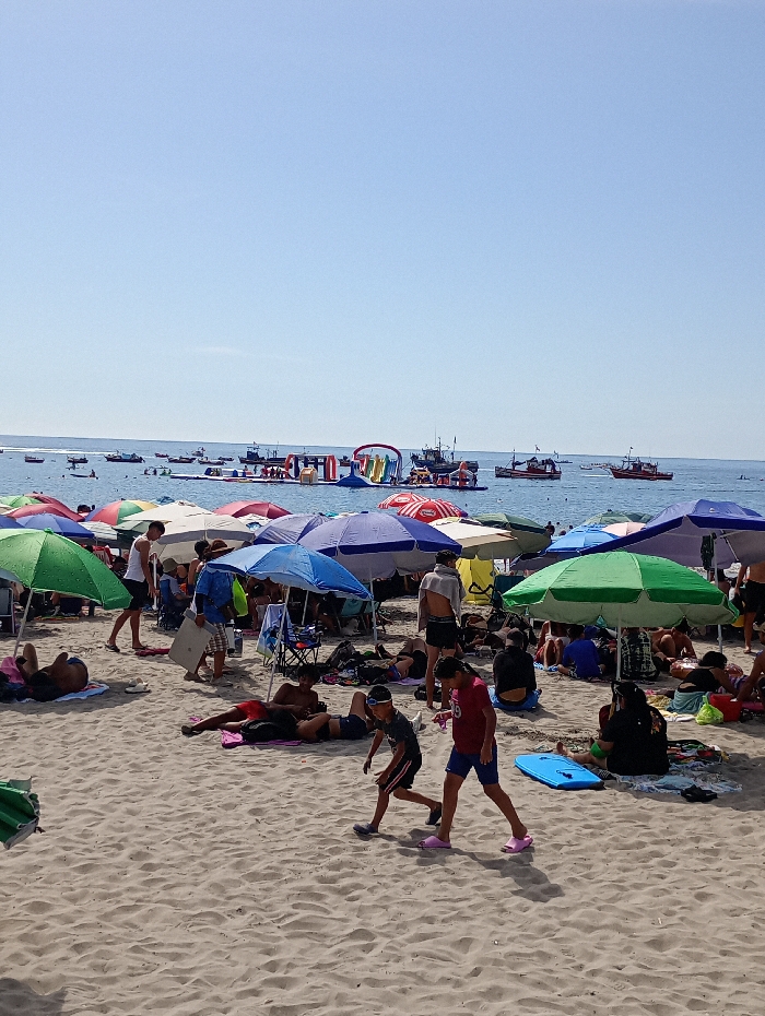 A vibrant beach scene unfolds under a clear sky. Beachgoers relax under a colorful array of umbrellas. Several boats dot the water, along with an inflatable water park. In the foreground, two children walk across the sandy beach. The scene is filled with the energy of a summer day at the seaside.