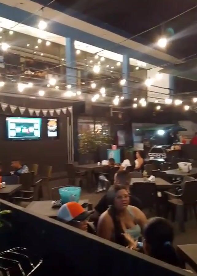 interior of a bar or restaurant. Tables and chairs are arranged throughout the space, and many people are seated and appear to be socializing. There are string lights hanging from the ceiling, adding to the ambiance. A television screen displays some content on the left. In the background, there is a staircase leading to an upper level and stacks of beverage crates can be seen. The camera pans across the space, providing a view of the layout and the people inside.