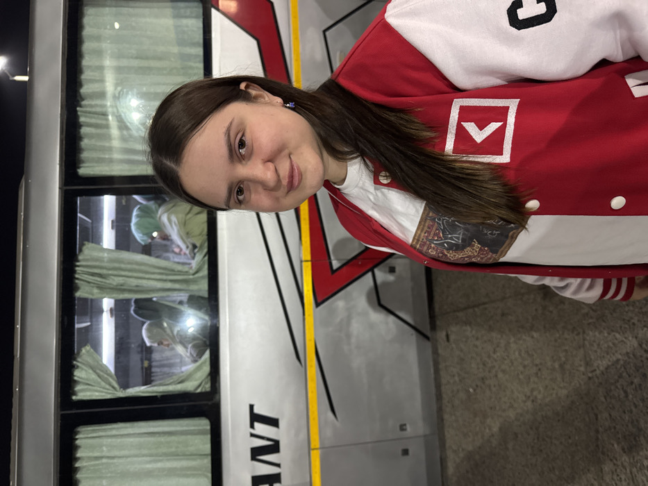 A young woman stands in front of a bus. She wears a red and white varsity jacket, a white t-shirt with a graphic, and small earrings. The bus is silver with red and yellow accents and has drawn curtains in the windows. The ground is a gray, possibly concrete, surface. The image appears to be taken at night or in a low-light environment, with a light source visible in the upper left.