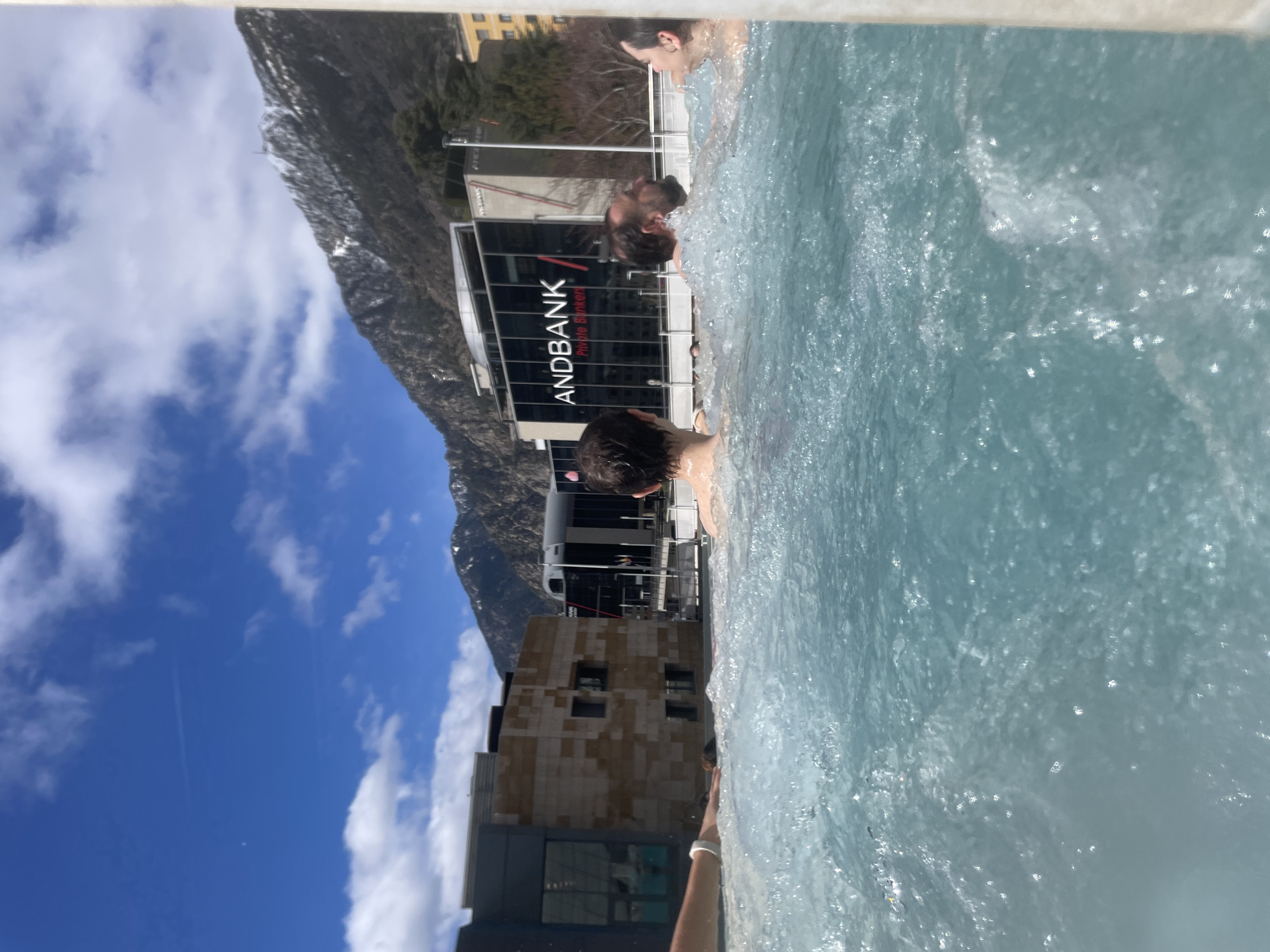 The image depicts a daytime scene from the city of Les Escaldes, Andorra. Three individuals are partially submerged in what appears to be a pool with light blue water. The individuals' faces and heads are visible above the water's surface. Behind the pool, the Andbank building is identifiable by the large lettering on its exterior. A mountain rises in the background, partially obscured by the building. The sky is blue with scattered white clouds.