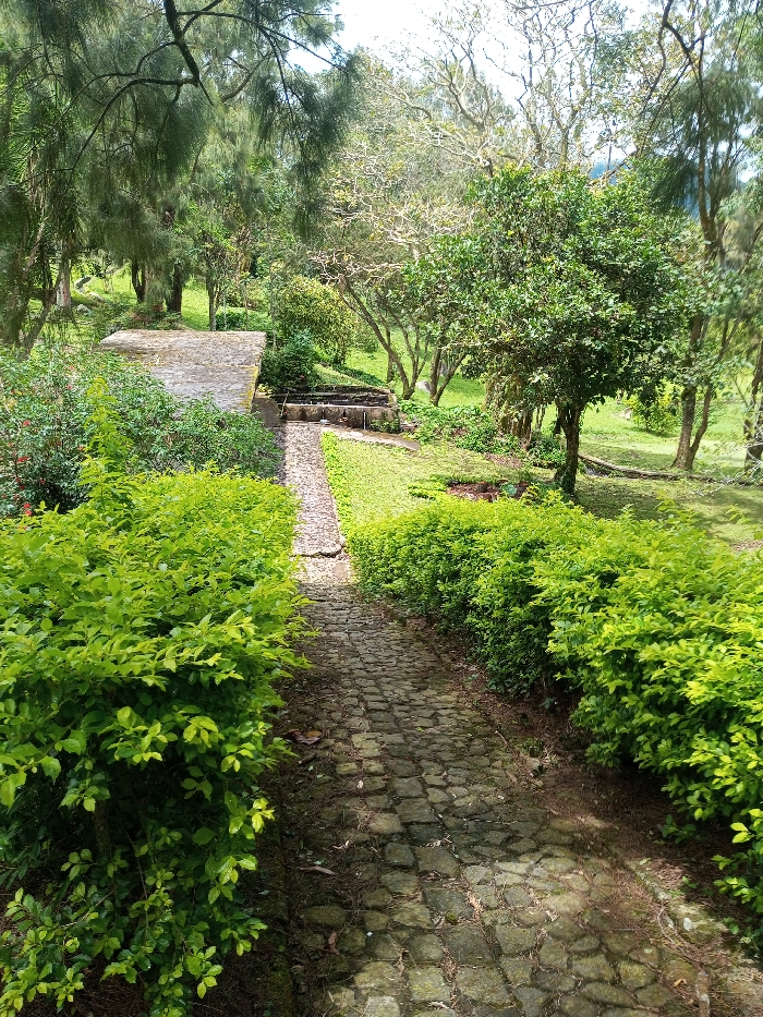 A stone path winds through a lush garden setting. Hedges line the path, leading toward stone steps and a concrete structure in the distance. Trees create a canopy overhead, filtering sunlight onto the path. The scene evokes a sense of tranquility and invites exploration.