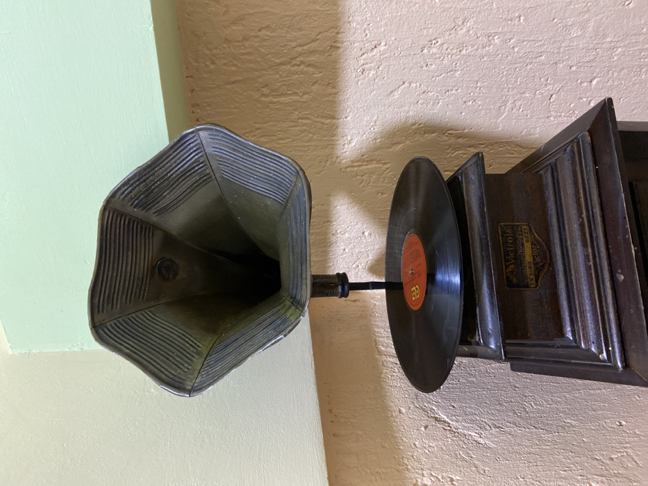A vintage Victrola record player sits angled against a wall, its ornate dark wood casing labeled "Victrola