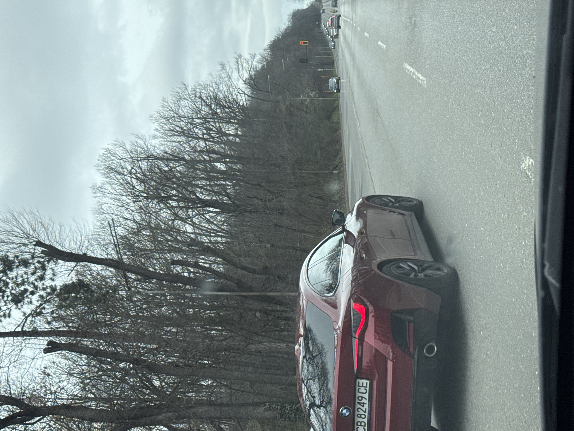 The image depicts a red BMW car with license plate "CB 8249 CE" driving on a road. On the left side of the road are bare trees, while on the right side are other vehicles and a traffic light. The scene appears to be on a road near Sofia, Bulgaria, as the license plate "CB" indicates Sofia. The sky is overcast. The image was likely taken from inside a car.