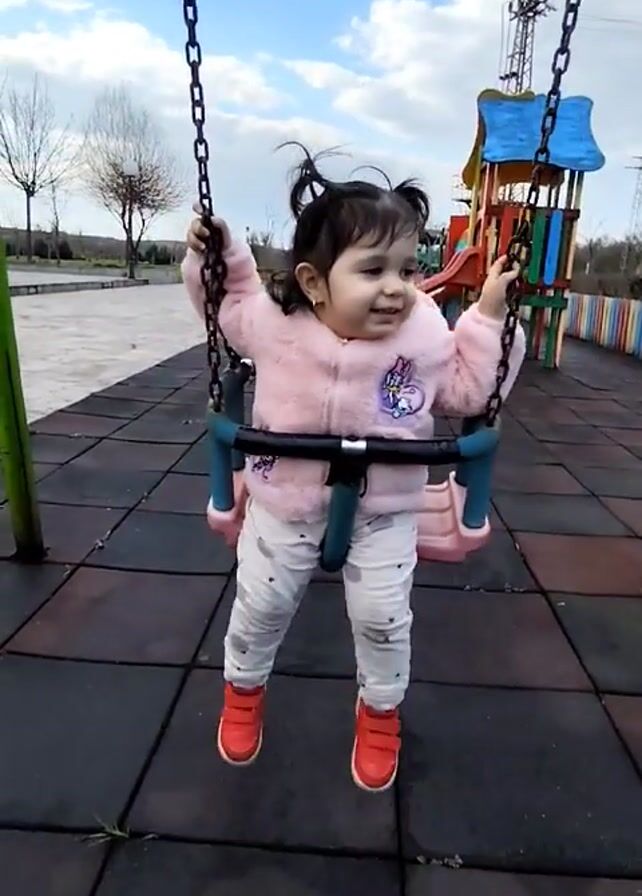 A young girl, about two years old, rides in a baby swing at a playground. The swing has a blue and green padded bar and a seat made of pink plastic. She wears a pink fuzzy jacket with a cartoon graphic, light-colored pants with white hearts, and red shoes. Her dark hair is pulled up into two small ponytails. She smiles briefly at the start. The playground has safety mats on the ground and a colorful play structure nearby. A blue sky with scattered clouds is visible overhead.