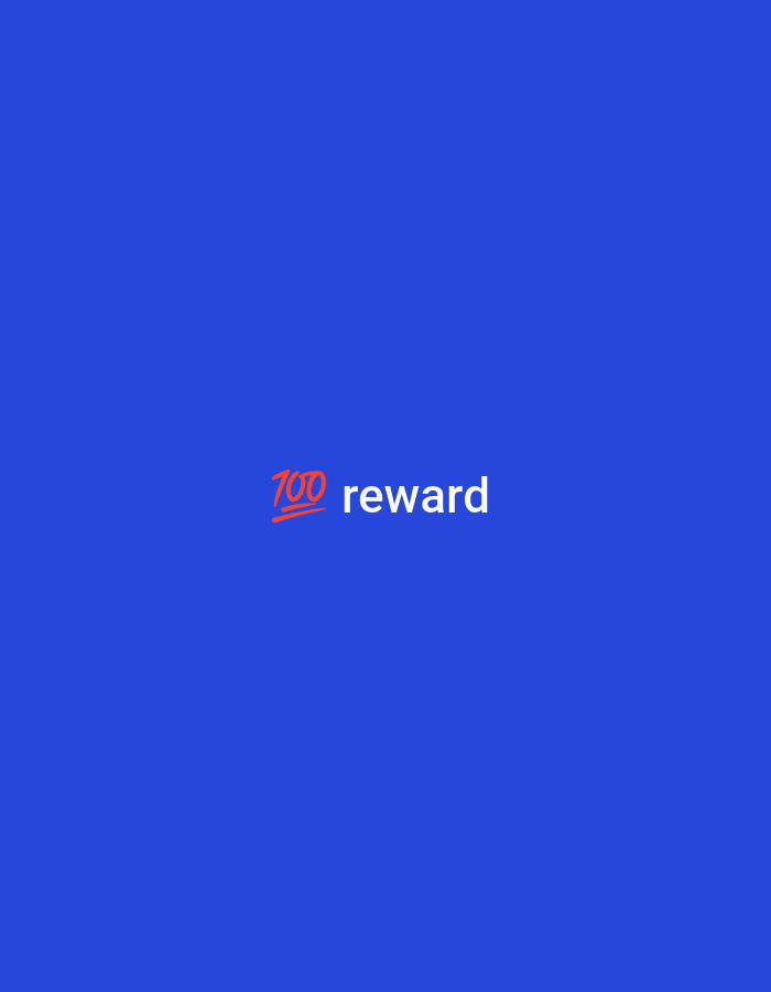 The image presents a solid, uniform royal blue background. Centrally positioned within the frame is the text "💯 reward". The "💯" is an emoji rendered in red, representing a perfect score or one hundred points, followed by the word "reward" in white, sans-serif typeface. No other subjects, objects, people, actions, interactions, or environmental details are visible. The image provides no visual information regarding a specific geographical location, including the city of Tecnimont camp, Russia.