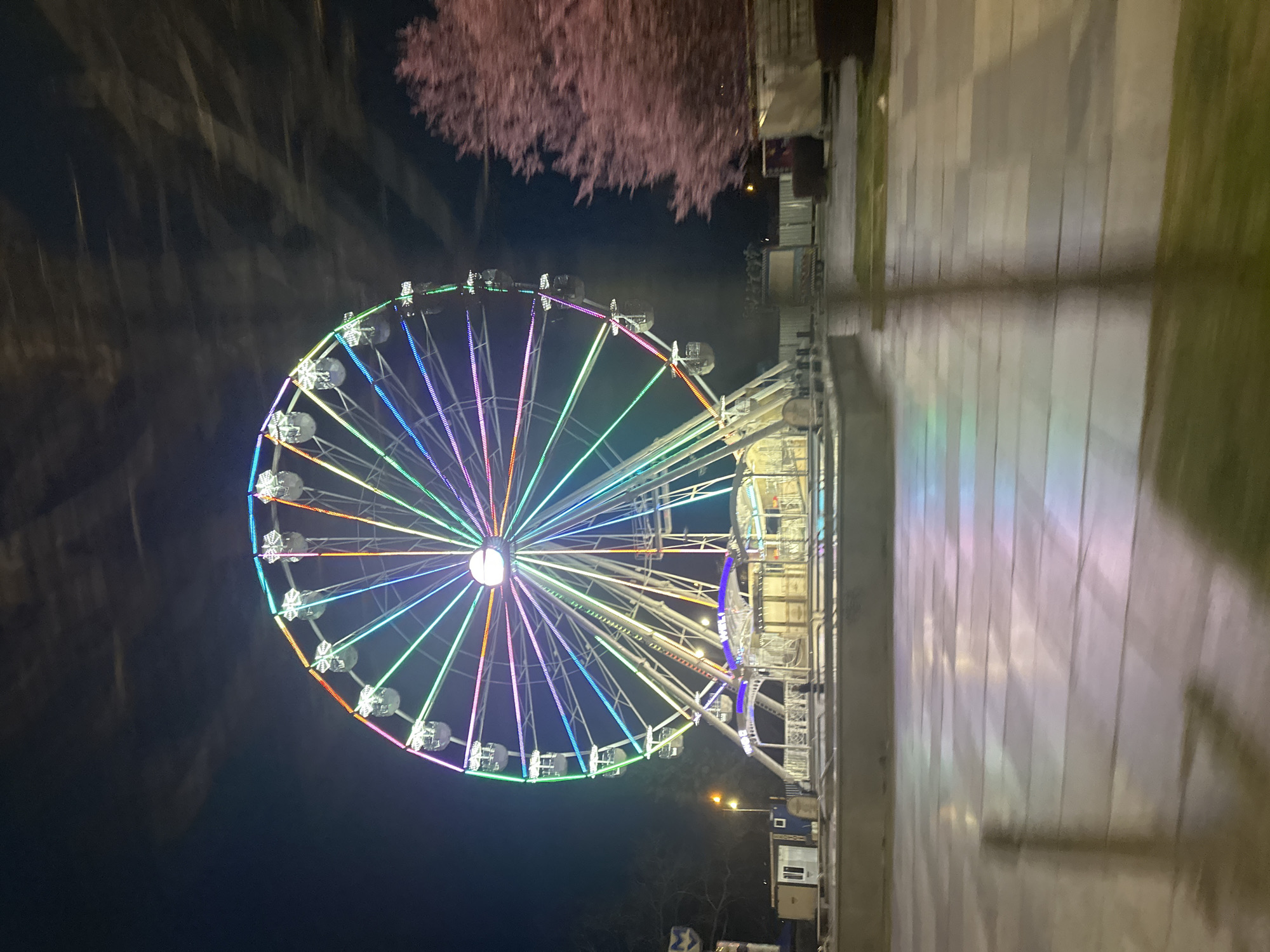 Ferris wheel illuminated with colored lights at night in Sofia, Bulgaria. The wheel is the central subject, with spokes radiating from a bright white center. Each spoke is lined with multicolored lights: red, orange, yellow, green, blue, and violet. There are passenger cars spaced around the circumference of the wheel. The base of the structure is visible, along with some surrounding buildings and streetlights. A tree with pink blooms is in the upper center. The ground appears to be paved with stone.