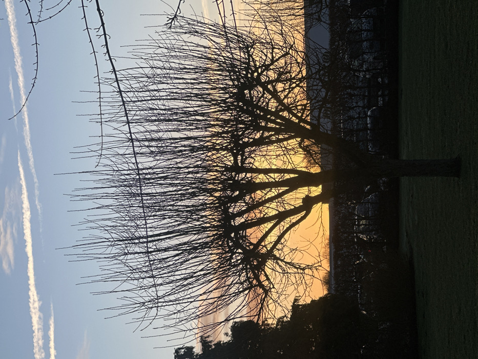 A silhouette of a tree dominates the image against a vibrant sunset. The sky transitions from blue to orange, with contrails visible. The tree's bare branches create an intricate network, contrasting with the sky's soft hues. Below, a line of silhouetted trees and greenery hints at a park or garden setting. A patch of grass is seen on the right. The overall mood evokes a sense of tranquility and the beauty of nature.