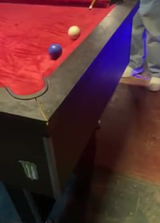 A person stands near a pool table with a red felt surface, about to take a shot. A white cue ball is positioned near the edge of the table, close to a corner pocket, and a blue ball is also on the table near the pocket. The person holds a cue stick and is aiming at the cue ball. The table has a black frame and is decorated with a Monster Energy sticker on one of the legs. The floor underneath the table appears to be a dark, somewhat worn surface. Other people are standing in the background, but they are out of focus. The table is illuminated with a bright blue light coming from underneath the table.
