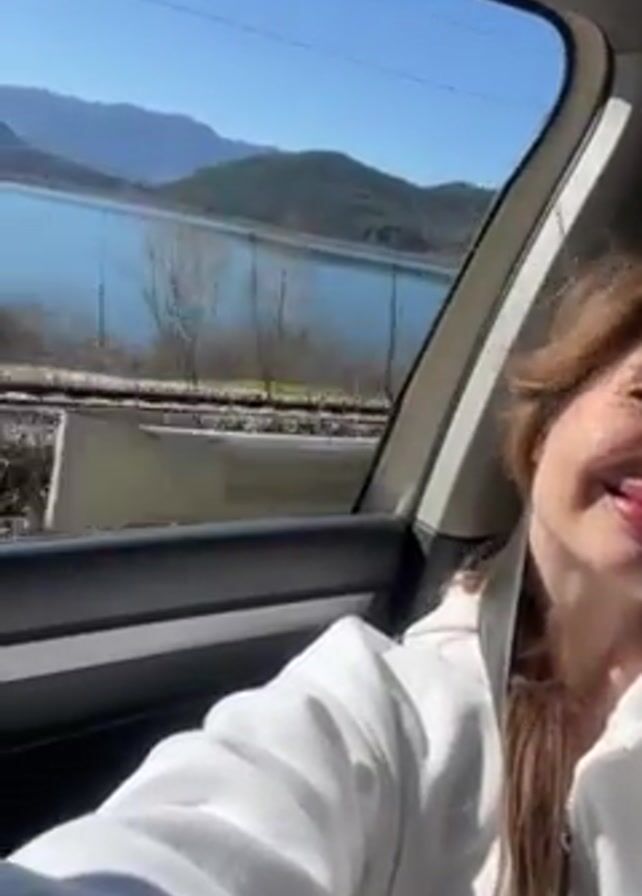 A young woman films a selfie video from inside a car. She has light brown hair, fair skin, and is wearing a white hooded sweatshirt. She smiles and puckers her lips at the camera. The car is moving, and the window behind her shows a landscape with a lake, mountains, a blue sky, and a railroad track. The lighting suggests it is a bright, sunny day.