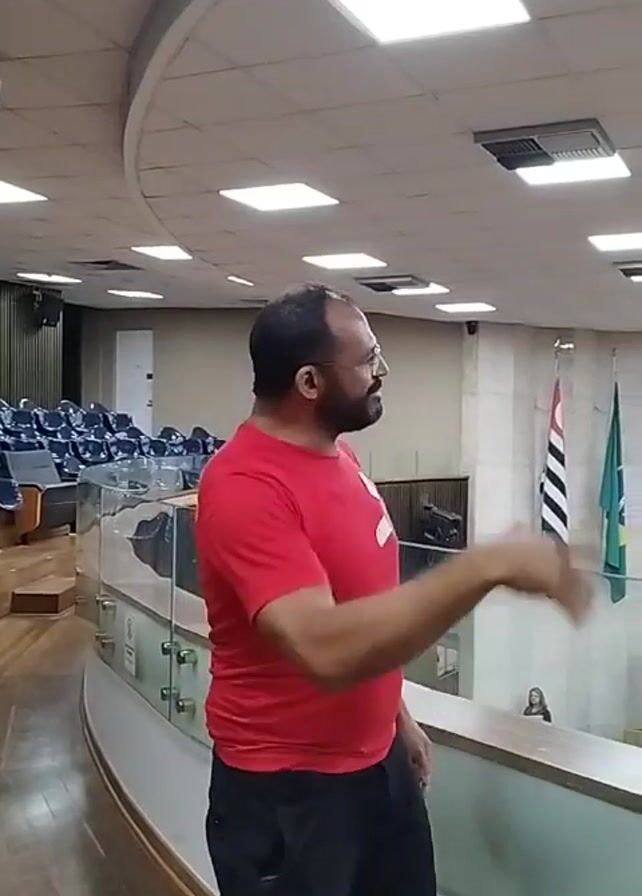 man standing in the balcony of a room with a large screen that reads "Câmara Municipal de São Paulo." The man, who is wearing a red shirt with the words "BOMBEIRO CIVIL" on the back, is gesturing towards the screen. He appears to be addressing someone or something in the room below. The room is large and has many rows of seats. There are also several people standing in the room below. The man is standing behind a glass barrier. There are flags behind him. The overall setting appears to be a government building.