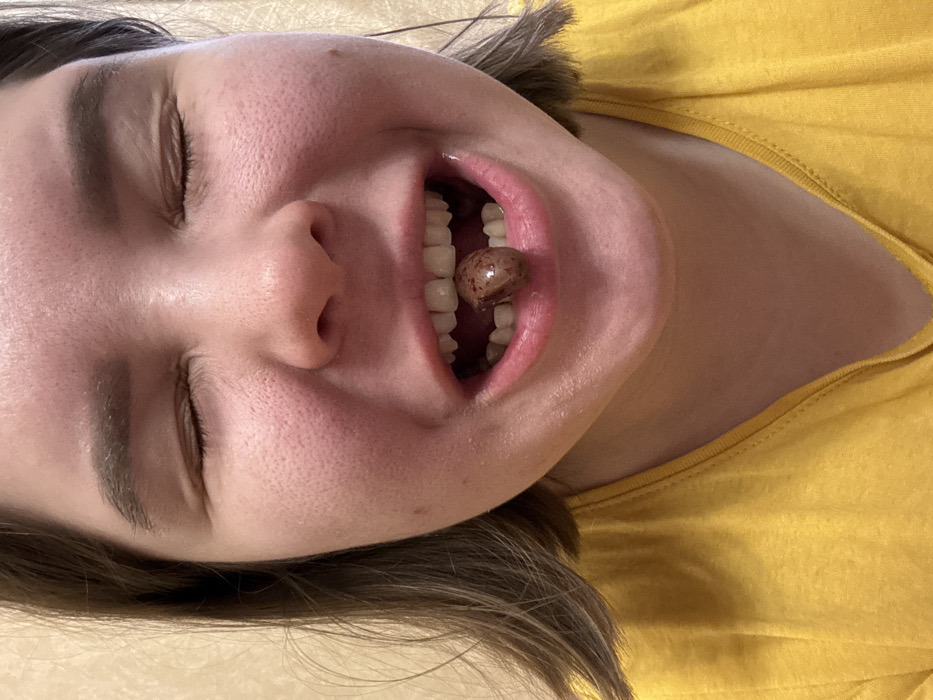 A frontal, close-up image depicts an adult female indoors in Nizhnekamsk, Russia. Her eyes are tightly closed, displaying deep creases at the outer canthi. Her mouth is open wide, revealing the upper and lower dentition. A single, irregularly shaped, dark reddish-brown object, exhibiting a speckled or marbled surface, rests on her tongue, suspended between her teeth. Her hair is brown, visible on both sides of her face. The facial skin texture is evident, with areas of redness on the cheeks and around the mouth. She is wearing a yellow garment. The background is a blurred, light-colored wall with a subtle pattern.