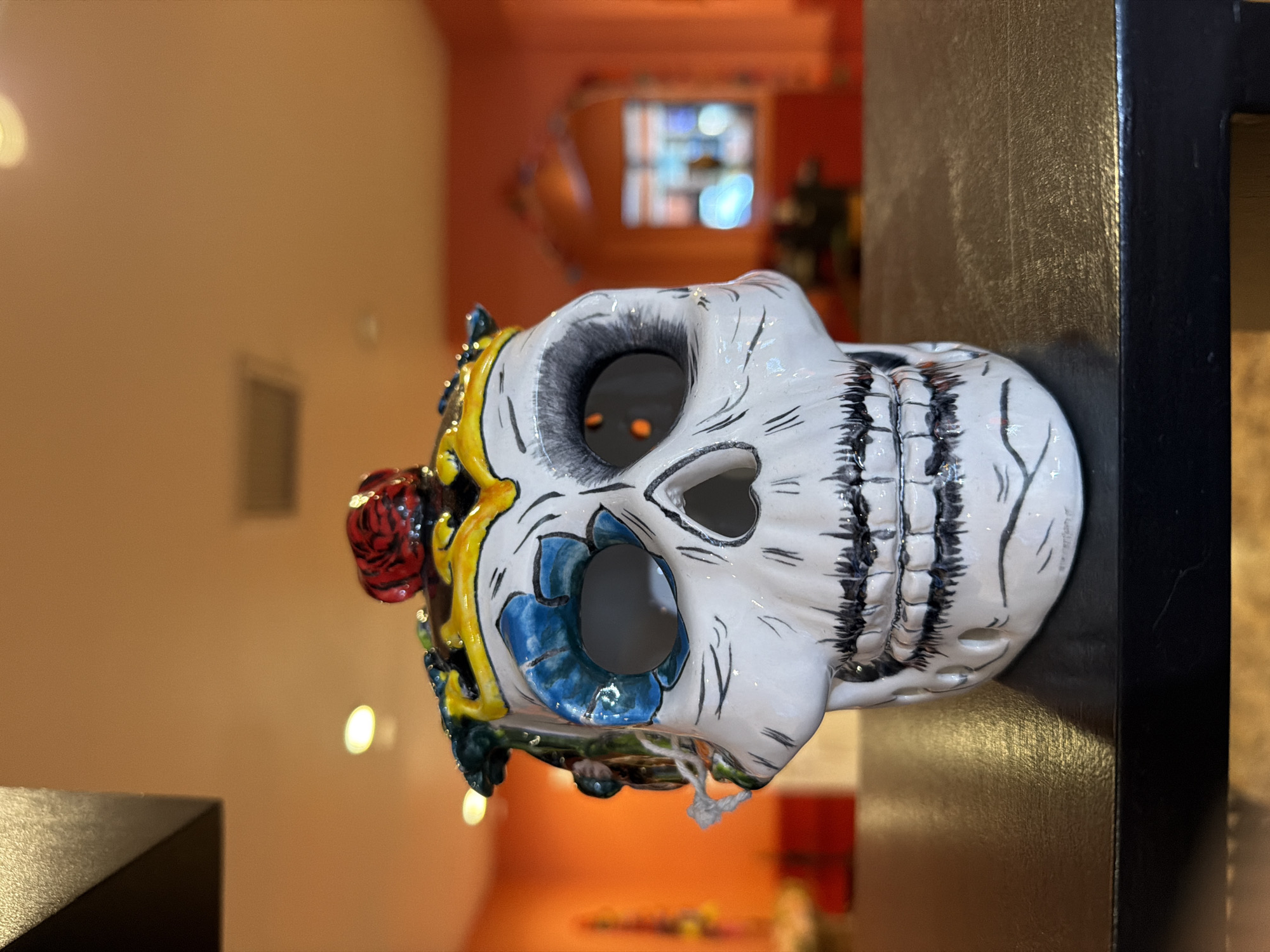 A ceramic Day of the Dead skull mask is displayed on a shelf inside a building