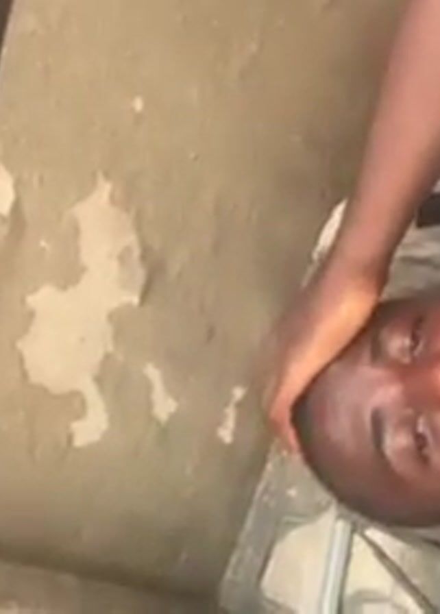 A man is visible in the video, lying on his back. He wears a black shirt and his hand is on his head. He is close to a wall with peeling paint. A metal pole is positioned beside him, and there is a tiled floor near him. The camera angle suggests it is low to the ground.