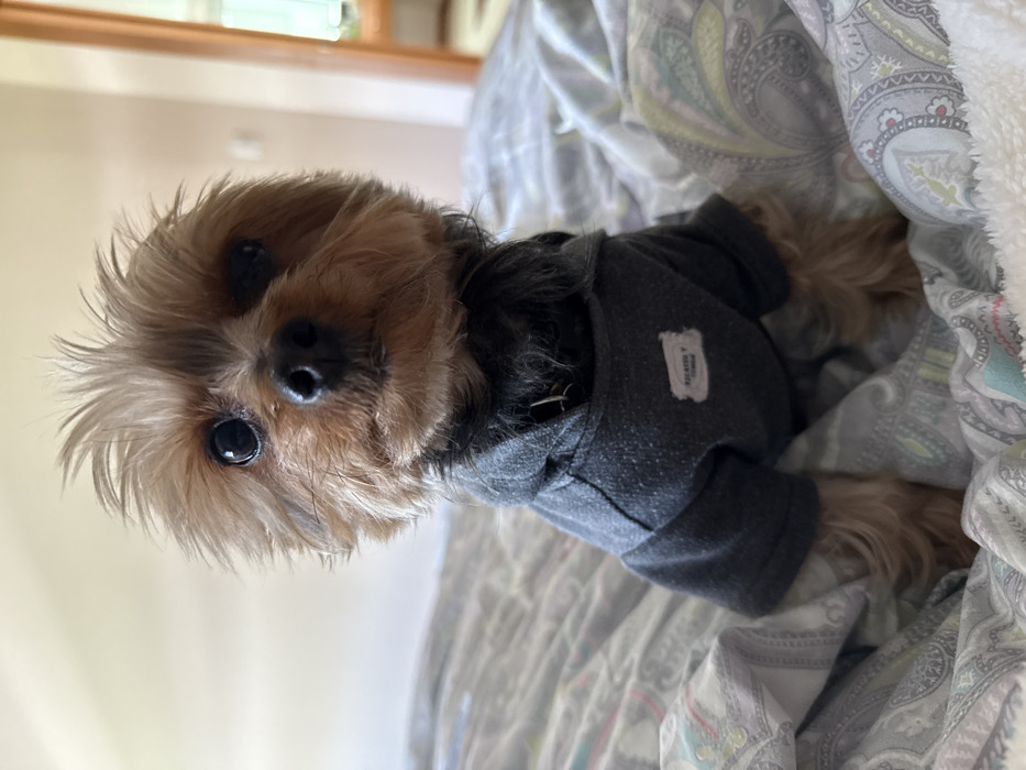 - "A small Yorkshire Terrier dog, partially nestled in patterned bedding, wears a grey hooded sweatshirt" by FM-jYf6s2, licensed under CC BY 4.0