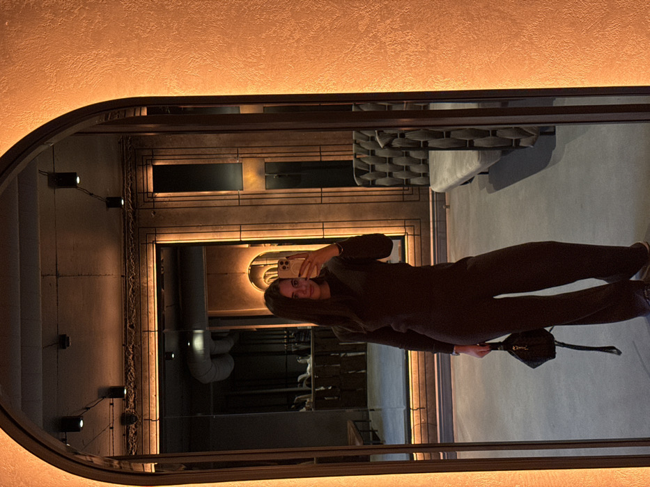 A forensic description of the scene reveals a lone female subject captured in a mirror selfie within a sophisticated indoor commercial establishment in Odesa, Ukraine, identified as The Fitz Club & Restaurant. **Person:** A young adult female, with long, dark brown hair, stands centered in the lower two-thirds of an arched mirror. She is wearing a dark, possibly charcoal or black, long-sleeved top and matching wide-leg trousers. Her right hand holds a light-colored smartphone, positioned to photograph her reflection. Her left hand holds a small, black, textured handbag with a braided strap. She exhibits a subtle smile, looking directly at the phone's lens. **Environment:** The photograph is taken from the perspective of an arched, floor-to-ceiling mirror, which features an illuminated, textured, warm orange-brown frame. The reflected interior showcases an industrial-style concrete ceiling fitted with black track lighting fixtures and exposed conduits. The walls display a blend of dark, possibly wood-paneled sections featuring geometric, Art Deco-inspired patterns and vertical lighting strips. A prominent horizontal strip of warm ambient light runs along a lower wall section in the reflection. To the right of the subject, a long, dark grey tufted (button-backed) upholstered bench or banquette is visible. To the far left, a simpler wooden bench is partially reflected. The flooring appears dark and uniform. In the deeper background, another arched reflective surface or doorway is visible, along with glimpses of white ventilation ducts on the ceiling and further seating, suggesting a spacious, multi-area venue. The overall lighting is warm and ambient, contributing to a refined atmosphere.