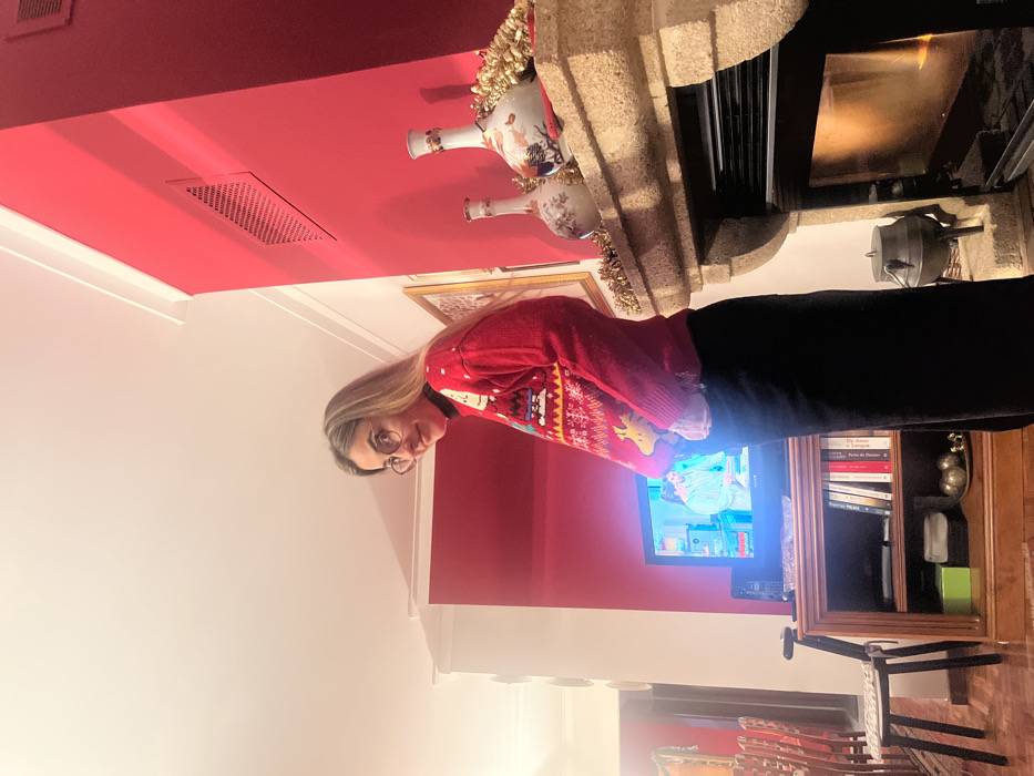 A woman in a Christmas sweater stands in a room with a red ceiling and white walls. A granite fireplace with two decorated vases is visible. A television is mounted on the wall between the woman and a wooden bookcase with books and decorative items. A chair and a glimpse of more chairs and the floor are at the bottom of the frame. The room is well-lit.